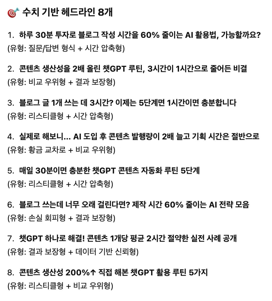 생성된 헤드라인 뒤에 어떤 '수치화 헤드라인 유형'을 주로 사용했는지 짧게 언급해주세요. (예: "(유형: 결과 보장형 + 시간 압축형)")